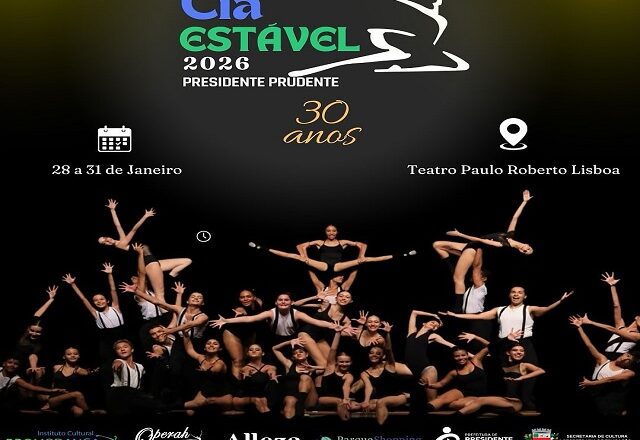 O Teatro Paulo Roberto Lisboa, da Secretaria Municipal de Cultura de Presidente Prudente (Secut), recebe a Cia Estável 2026, com grandes apresentações artísticas para o público, de 29 a 31 de janeiro, e entrada solidária, apenas 1 kg de alimento não perecível, itens que serão revertidos a entidades assistenciais.